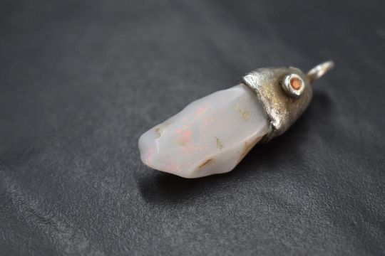 A white metal presumed silver mounted raw opal pendant, the raw opal having an organic moulded mount set with an orange sapphire, approximately 3.5cm, 4.6g. The opal having good play-of-colour with predominantly red-orange tones