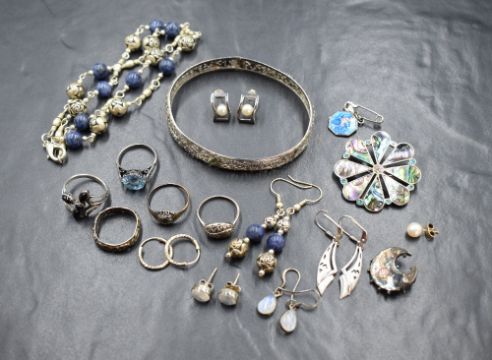 An assortment of silver and white metal jewellery, including a filigree bracelet, rings, a Victorian silver brooch and moonstone set drop earrings, 66g gross