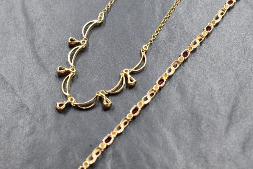 A 14ct gold ruby and diamond set necklace, the illusion set diamond chips, interspersed with gold swags having five pear cut ruby drops, on a fine belcher link chain, marked 14kt, along with a matched 10ct gold ruby set bracelet, having ten oval cut rubies flanked by illusion settings, marked 10k, 18cm, 8.7g gross