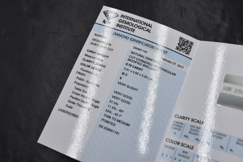A platinum diamond solitaire ring having a 0.70ct rectangular brilliant cut diamond in a four claw raised mount on a platinum loop, size M & 4.2g, ring comes with IGI diamond report dated 2017 stating diamond is: clarity SI2 & colour scale E