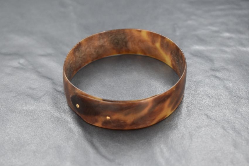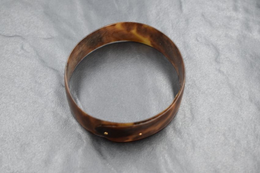 A Victorian tortoise shell bangle having yellow metal pin fasteners, inner diameter approx 68mm