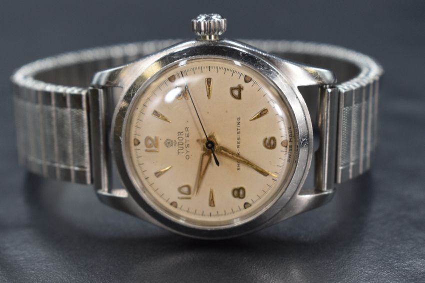 A gent's 1950's Tudor Oyster automatic wrist watch having Arabic and numeral baton dial with sweeping second hand on a cream face in a steel case numbered: 75392/7803 on a stainless steel stretch strap. Vendor states that watch recently had a £400 service. Watch ticks but not tested for functionality