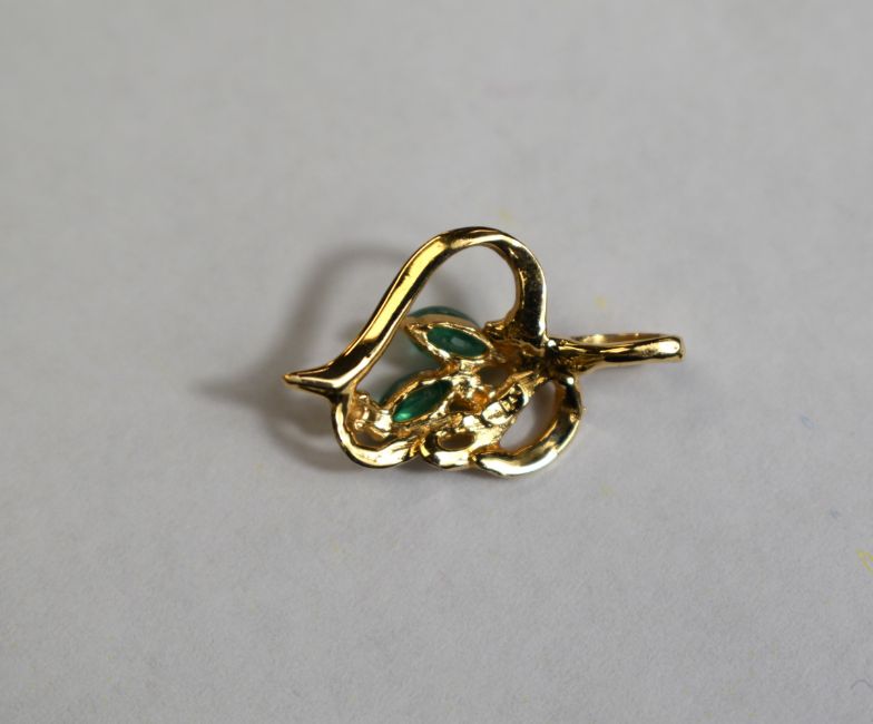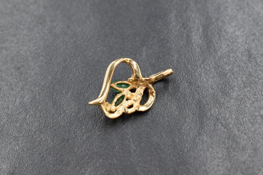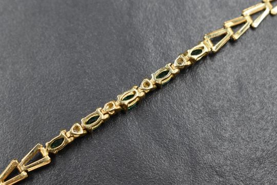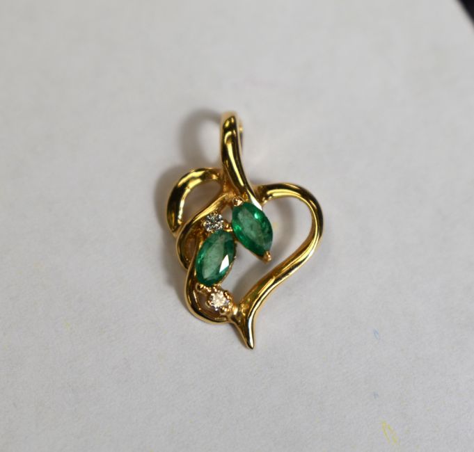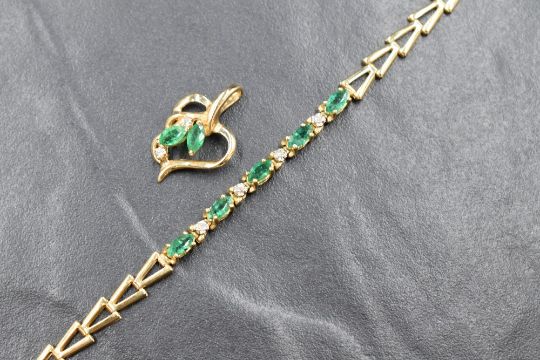 A 14ct gold emerald and diamond set bracelet, the five marquise cut emeralds interspersed with four illusion set diamond chips, on a decorative pierced chain with box clasp, marked 14k, along with a matched 14ct gold emerald and diamond set pendant, also having two marquise cut emeralds and two round brilliant cut diamonds in a openwork heart motif, marked 14k, 5.6g gross