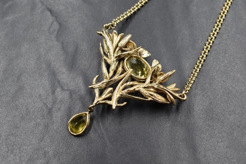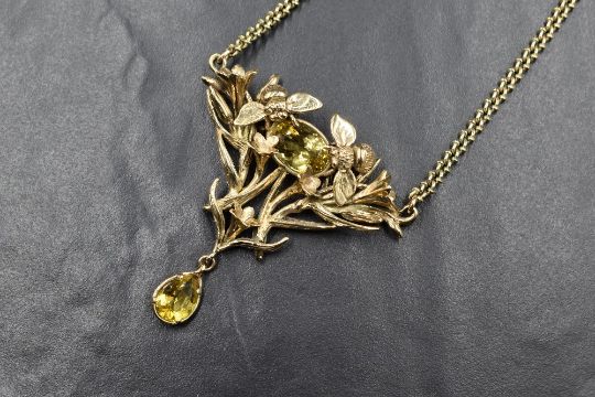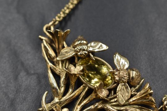 A 9ct gold Art Nouveau style citrine set necklace by Lexi Dick, the central oval cut citrine flanked by two gold bees within an intertwining foliate design with an articulated pear cut citrine drop, marked 375 London 1997, on a fancy curb link chain, 32.2g