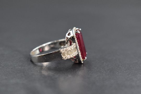 An 18ct white gold ruby and diamond set cluster ring, the central emerald cut ruby measuring approximately 11mm x 6mm x 3mm in an eighteen round brilliant cut diamond surround, having six baguette cut diamonds and ten round brilliant cut diamonds to each squared shoulder, marked 750, ring size M, 6.5g. Ruby loose in setting with various inclusions