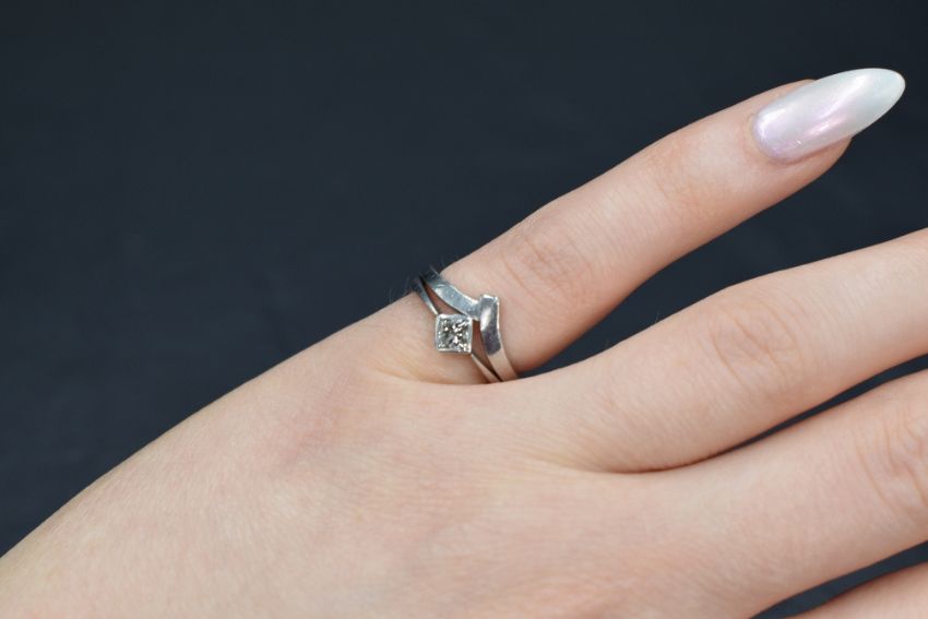 A platinum wedding set, comprising a diamond set solitaire and band, the princess cut diamond measuring approximately 0.25ct in a bezel setting, along with a wishbone motif band, both marked 950, ring size G-H, 5.8g gross