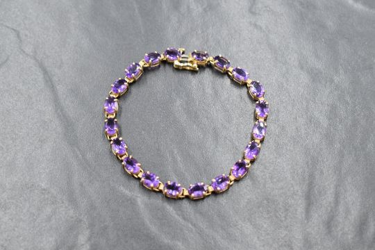 A 10ct gold amethyst set tennis bracelet, the twenty oval cut amethysts in four claw settings, marked 10k, 18cm, 8.2g