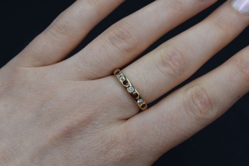 A 9ct gold half eternity ring being set with seven cubic zirconia and red paste stones on a 9ct gold loop, size N & approx 1.7g