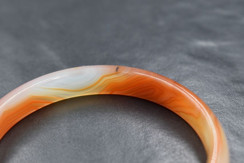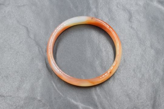 A carved banded agate bangle, having orange and white tones, 6cm internal diameter, 19.6g