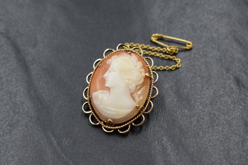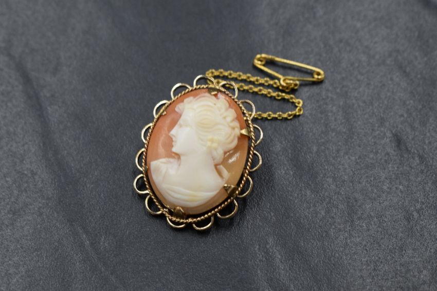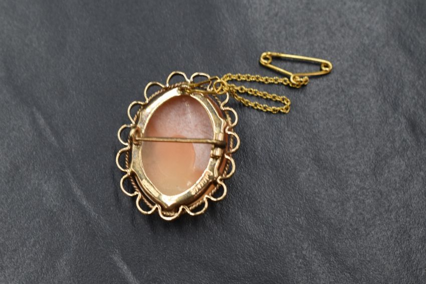 A 9ct gold cameo brooch depicting a maiden in profile in a claw set decorative mount with a safety chain, approx 5.3g gross