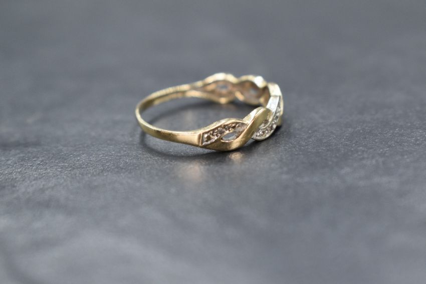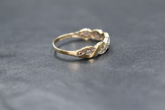 A 9ct gold band ring having open twist detail set with diamond chips, size Q & 1.3g