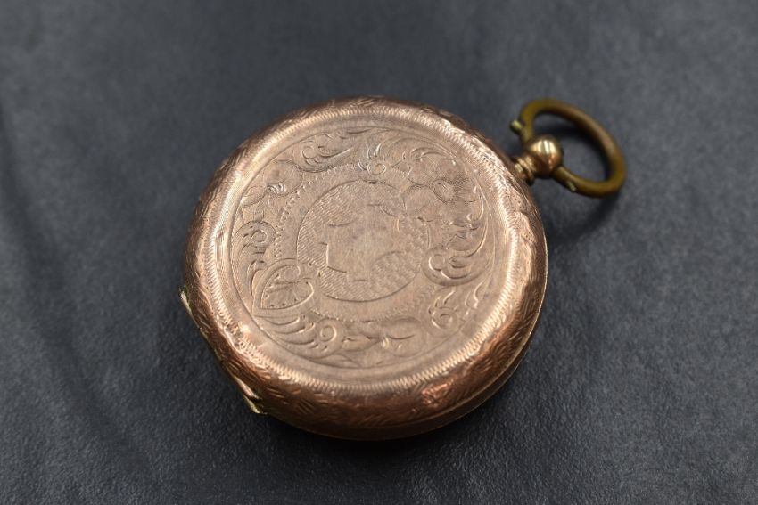 A 9ct gold open face key wound pocket watch, the golden dial having Roman numerals and floral centre, with scroll decoration to the case, marked 9ct, the inner case being base metal, dial approximately 3.5cm diameter, 31.4g