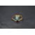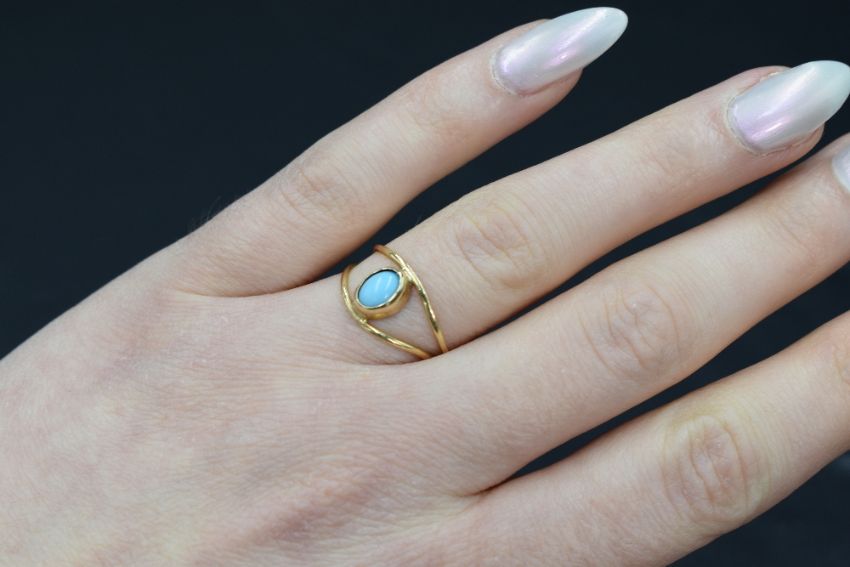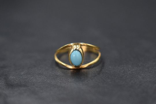 A yellow metal split loop ring stamped 18/750 having a central turquoise in a collared mount, size N & 1.1g