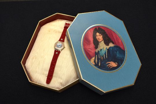 A new in box Swatch Roi Soleil Christmas Special 1993 wristwatch, the blue dial having golden Roman numerals in a clear case, on a red strap with floral paste set studs, in original presentation box with protective sleeve