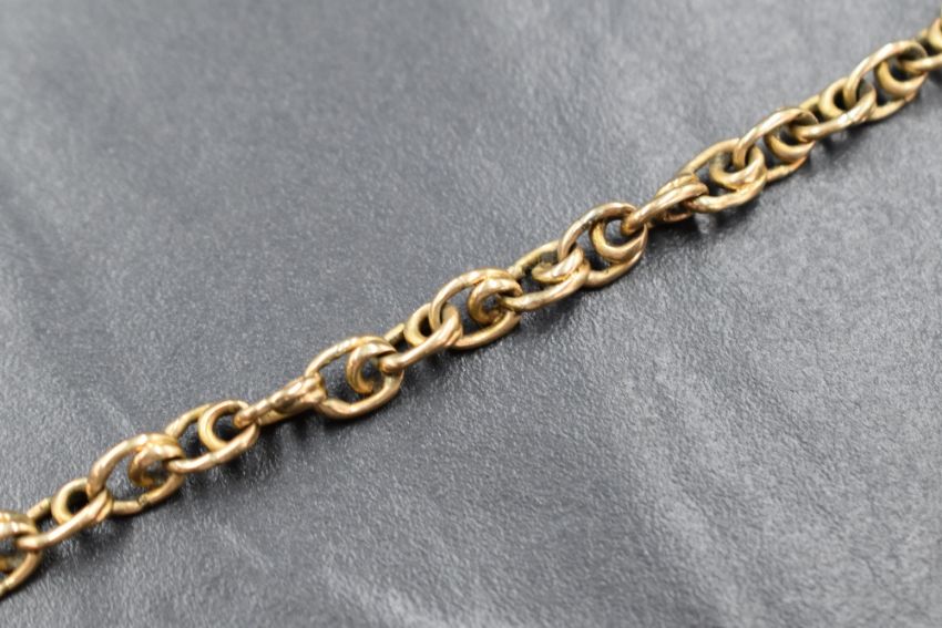A yellow metal fancy link chain with clasp marked 18, chain approx 330mm long & 19g