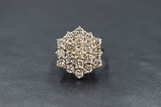 An 18ct white gold diamond set cluster ring, the nineteen round brilliant cut diamonds in a step setting, measuring approximately 3.5ct total, marked 750, ring size N-O, 7.7g