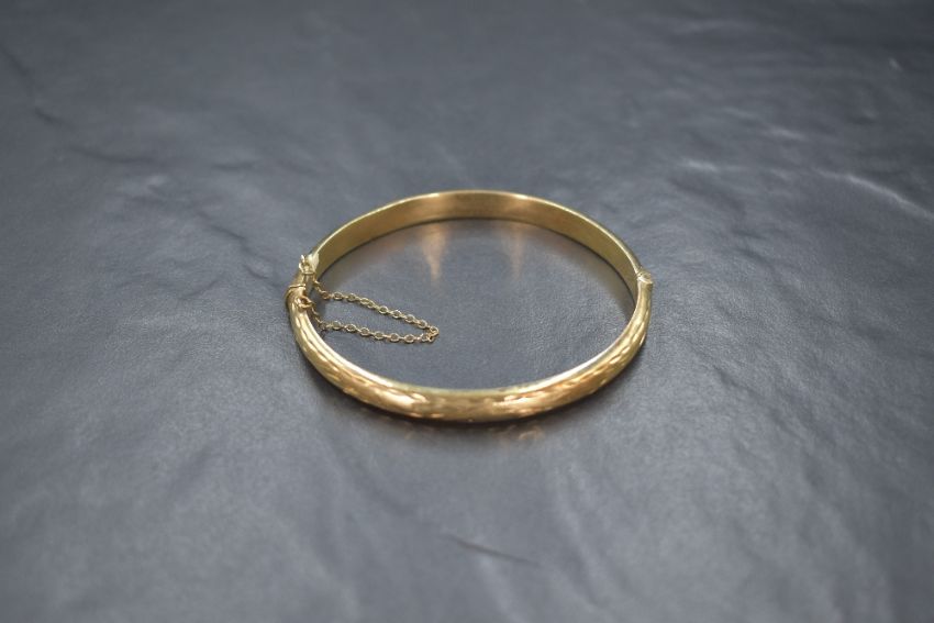 A 9ct gold hinged bangle, having decorative scroll engraving to one side, with safety chain, marked 375, 6cm diameter, 8.2g. Some dents to body