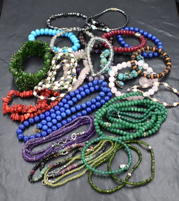 A selection of semi precious rough cut and polished stone necklaces and bracelets including a Thomas Sabo turquoise bracelet, hematite, lapis lazuli, coral etc