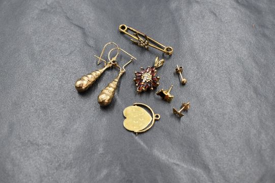 A small selection of yellow metal jewellery including a small bar brooch with seed pearl set swallow motif, a pair of moulded drop loop earrings, an I love You spinning pendant, odd earrings and a pendant, approx 5.6g gross