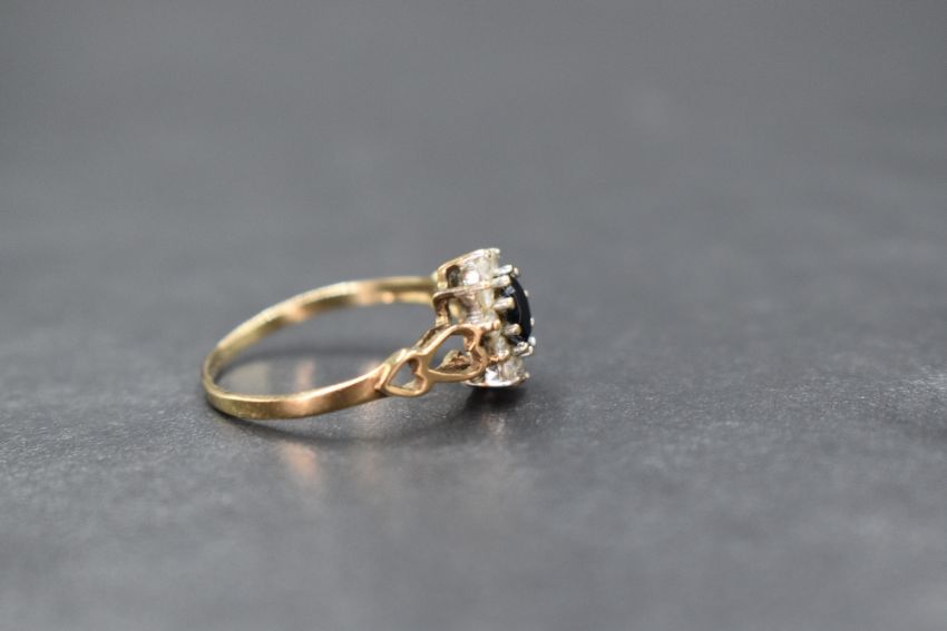 A 9ct gold sapphire and cubic zirconia set cluster ring, the oval cut sapphire in a ten cubic zirconia surround, with pierced heart shoulders, marked 375, ring size L, 1.5g