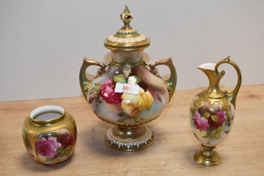 Three late 19th to early 20th-century Royal Worcester blush ivory porcelain wares, featuring delicate hand painted rose motifs with gilt detailing, to include a small vase, a small ewer and lidded vase, all marked to base, (3), condition is consistent with age and use, significant fixed damage to all, with visible fixed cracks and chips, all sold as seen.