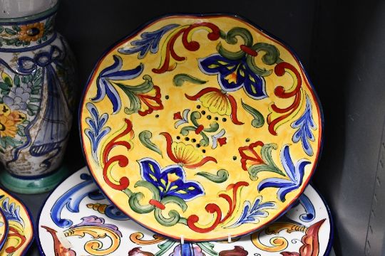 A quantity of 20th-century Maxcera Talavera-style hand-painted plates, to include three yellow scalloped-edge dinner plates, a larger colourful example with a small yellow floral example; sold with a large Tuscan-style charger with delicately rendered lemons and an Italian majolica pottery vase, all marked to the base, (7), condition consistent with age and use, with large areas of surface wear to the vase, and no visible chips, cracks or fixed damage to any of the pieces.