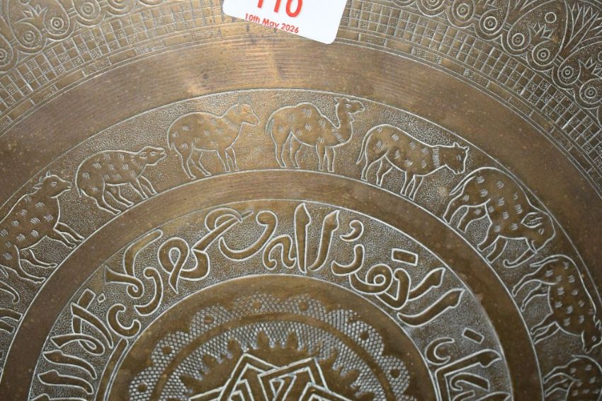 A large mid to late 20th-century Eastern brass charger, having engraved floral and scrollwork motifs with Arabic-calligraphy and various animals around a central geometric star motif, unmarked, 59cm in diameter, condition is consistent with age and use, visible surface patina and wear.