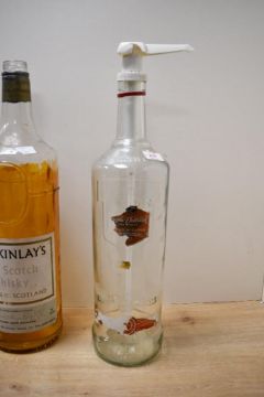 Two large vintage spirit bottles, both empty, comprising a Mackinlay's Old Scotch Whisky and a Smirnoff vodka pump example, each stands approximately 50 cm tall, condition is consistent with age and use, with minor surface wear; both are presented empty.