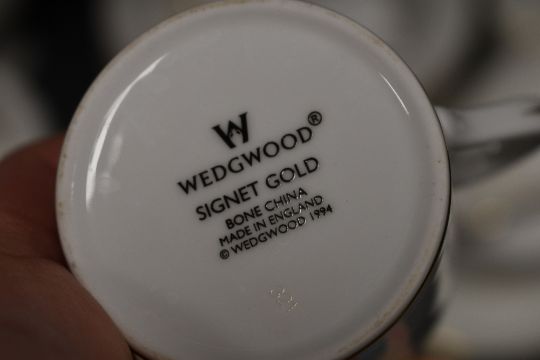 A selection of 20th-century Wedgwood bone china 'Signet Gold' tableware, to feature a lidded tureen, large dinner plates, a oval serving platter, a gravy bowl, coffee cups, shallow bowls and more, all marked to base, (approximately 46), condition is consistent with age and use, having visible areas of surface wear and gilt wear to all, sold as seen.
