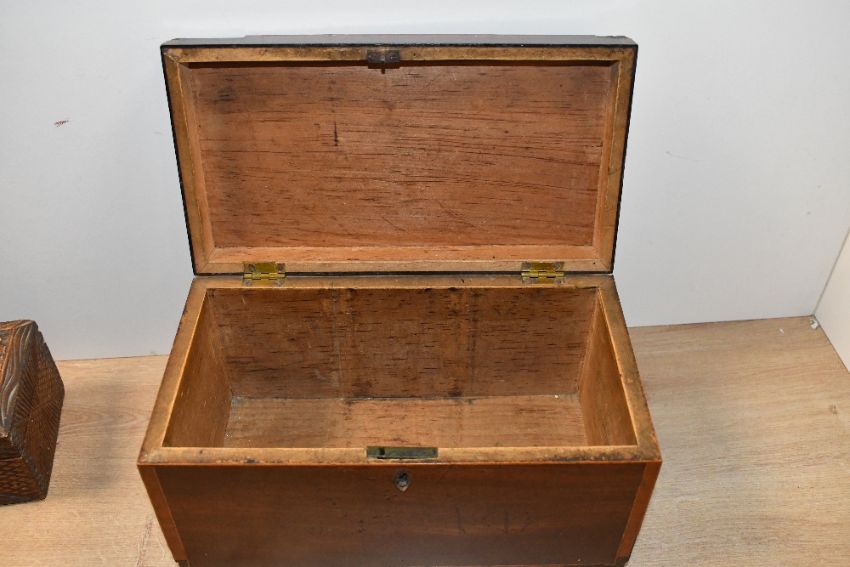 Two early to mid 20th-century hard wood boxes, to feature a hand carved example; sold with a carved wall shelf bracket, all unmarked, (3), condition is consistent with age and use, having visible areas of surface wear to all, carved box has a damaged hinge, corner chips and missing pieces of wood to other example, all sold as seen.