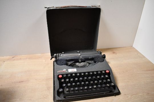 A mid 20th-century Empire Aristocrat portable manual typewriter, marked to front, 28cm x 28cm, condition is consistent with age and use.