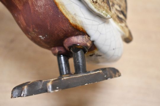 A charming contemporary studio pottery rooster sculpture, featuring a crackle-glazed finish to the plumage, wings, and tail, in a rustic brown and red colour palette, with an expressive face and stylised features, unmarked, 30cm, condition is consistent with age and use, with no visible chips, cracks, or signs of restoration.