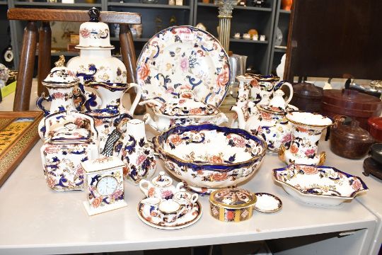 A fine selection of 20th-century Mason's Ironestone 'Mandalay' wares, to feature Oriental-style floral and foliate decoration with featuring gilt detailing, to include a large lidded ginger jar; a small mantel clock; a decorative bowl; a large plate; teapots; a lidded soup tureen; a lidded potpourri; graduated ewers and more, all marked to base, (approximately 22 pieces), condition is consistent with age and use, having visible areas of surface wear, no visible chips, cracks of fixed damage, sold as seen.
