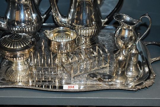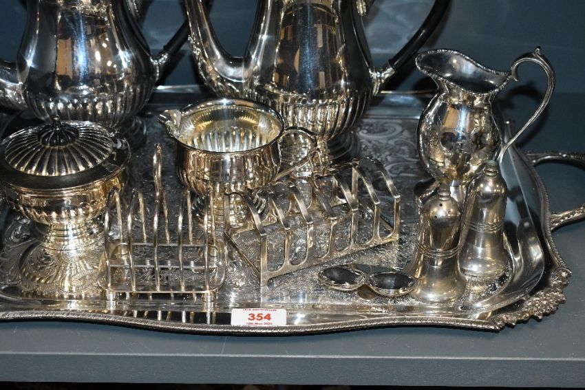 A selection of 19th to early 20th-century EPNS and metal tableware, to feature a large twin-handled ornate serving tray; two coffee pots; salt and pepper shakers and more, all marked to base, (approximately 13), condition is consistent with age and use, having visible areas of wear to most, all sold as seen.