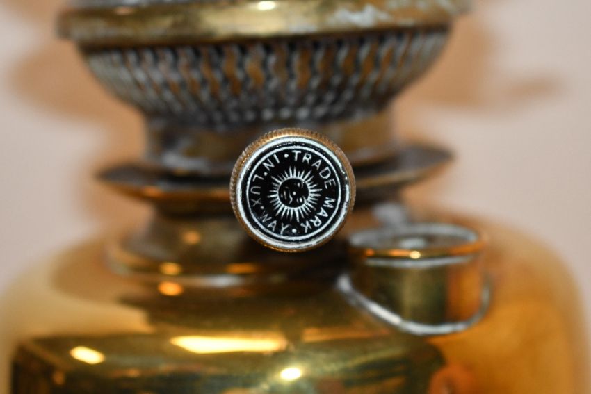 A selection of 20th-century brassware, to feature a four armed candelabra, an Edwardian-style oil lamp converted to electric with a partially frosted glass shade having a ruffled rim; an ornately decorated brass tray and more, mostly unmarked, (6), condition is consistent with age and use, having visible areas of surface wear to all, sold as seen.
