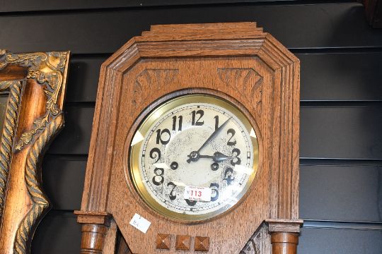 A large early 20th-century Westminster Ting Tang oak wall clock, having Arabic hours, featuring Art Deco-style fan-like motif panels, turned wood columns and a large brass pendulum, thought to have a chime 7 day movement, unmarked as cannot access back plate, approximately 74cm, condition is consistent with age and use, visible surface wear to clock face, with keys.