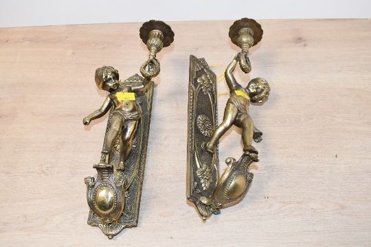 Two late 19th to early 20th-century French-style brass Putti wall sconces, featuring floral decorations, foliage and swag detailing, both unmarked but hanging fixture to reverse, approximately 30cm, condition is consistent with age and use, having visible areas of surface and metal wear, sold as seen.