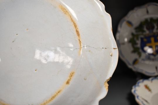 Six 19th/20th-century French-style ceramic armorial plates, having scalloped rims and featuring hand painted shield motifs, all unmarked, all approximately 26cm in diameter, condition is consistent with age and use, having visible areas of surface wear to all, some glaze wear to rims and to the reverses, visible hairline cracks to some, large chip to rim of one, all sold as seen.
