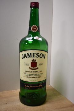 Two large vintage spirit bottles, both empty, comprising a J&F Martell VS Cognac and a Jameson Irish Whisky, each stands approximately 50 cm tall, condition is consistent with age and use, with minor surface wear; both are presented empty.