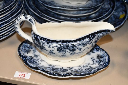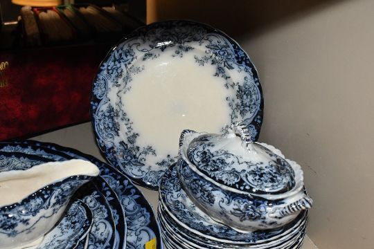 A selection of late 19th-century Keeling & Companies 'Chatsworth' ironestone tableware, to feature deep blue floral and scrollwork decoration with delicate scalloped rim detailing, to include a large tureen, graduated serving platters, dinner plates, soup tureens and more, all marked or impressed to base, (approximately 35 pieces), condition is consistent with age and use, having some visible areas of surface wear to all, some areas of surface wear and small chips to rims, all sold as seen.
