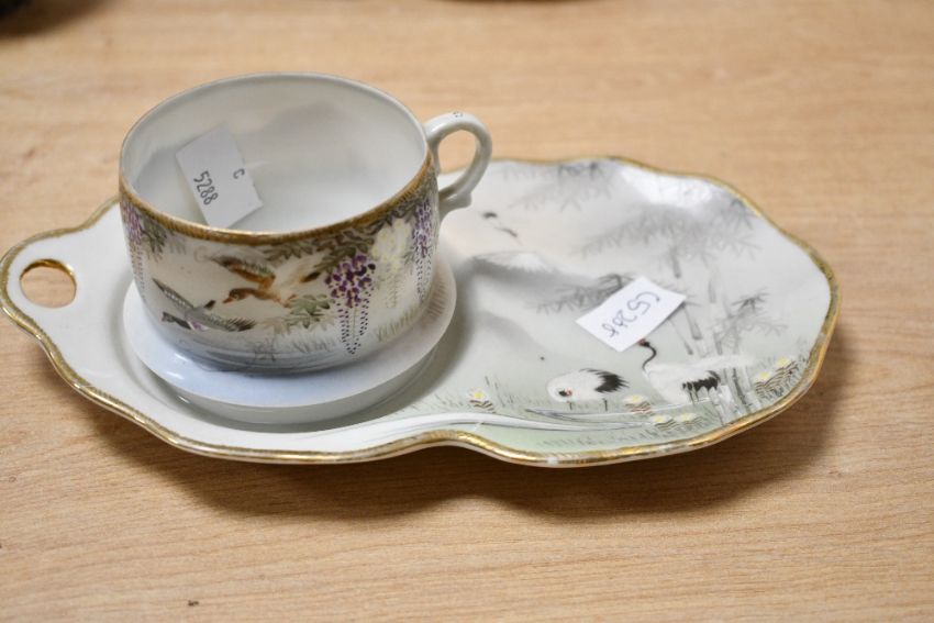 Thought to be late 19th to early 20th-century Japanese 'eggshell' porcelain part tea service, featuring delicately hand painted landscape scenes with an accompanying selection of sweet birds and floral decoration, to feature teacups with side saucers/plates; a tea pot, milk creamer and sugar pot, all having lids with blossom-formed finials, all marked, (8), condition is consistent with age and use, having some visible areas of surface wear to all, sold as seen.
