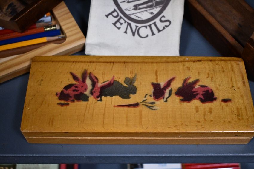 A selection of vintage wooden pencil cases, to feature a sweet rabbit example and a dark wood two-tiered foldable example; sold with a small quantity of pencils and a fabric drawstring bag, mostly unmarked, (3 cases, 1 bag and 7 pencils), condition is consistent with age and use, having visible areas of surface wear to all, sold as seen.