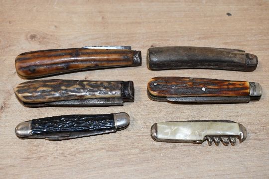 A selection of late 19th to 20th-century pen knives and multi tools, to feature mainly stag handled examples, most marked very faintly to blades, (6), condition is consistent with age and use, visible areas of surface wear to all and metal wear, some of blades do not open smoothly, sold as seen.
