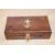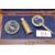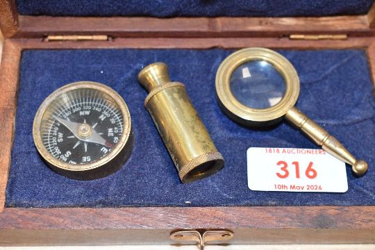 A vintage brass navigation set, to feature a telescope, compass and magnifying glass house in a hinged wooden box, having a brass ships anchor inlay atop, unmarked, 15cm x 8.5cm box, condition is consistent with age and use, having some visible areas of surface and metal wear to all, sold as seen.