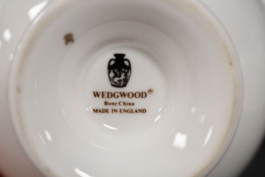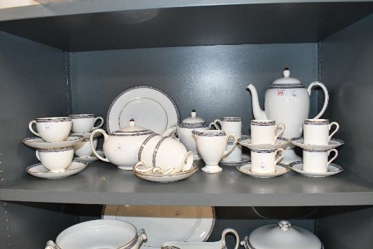A selection of 20th-century Wedgwood bone china 'Palatia' tableware, featuring a navy blue and gold Greek Key band on a crisp white body, with gilt detailing, to include cups, saucers, teapot and coffee pot, dinner plates, lidded tureens, gravy boat, side plates, coffee cups and more, all marked to base, (approximately 53 pieces), condition is consistent with age and use, having no visible chips, cracks or fixed damage, all sold as seen.