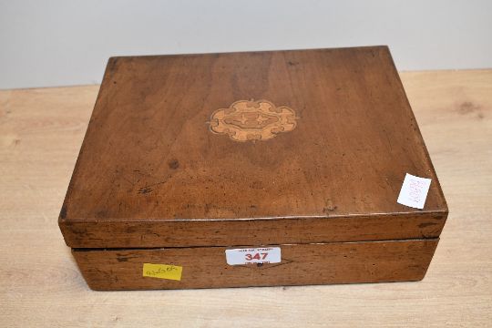 A 19th-century wooden marquetry inlaid jewellery box with contents, to feature a small EPNS vesta case with floral etched detailing, a small white metal swivel fob set with dark hardstone, a pair of Whiteley metal foldable pince-nez in original leather case, three small Masonic-style printing blocks, four gilt pin badges, photo cards and more, some marked but not all, 24cm x 18cm box, condition is consistent with age and use, having some visible areas of wear to box and contents, all sold as seen.