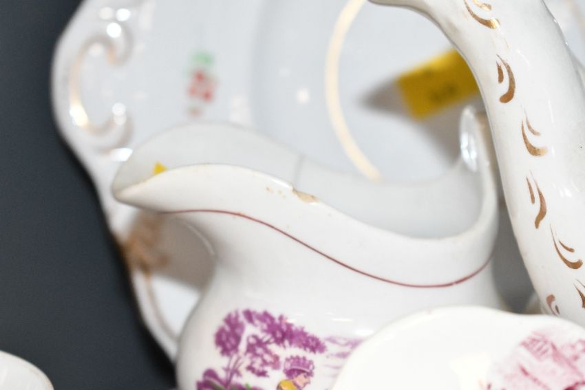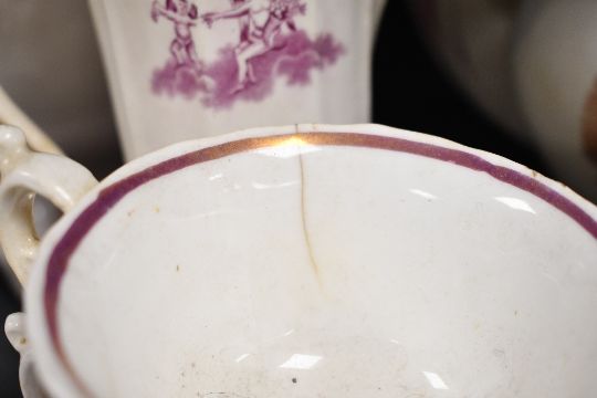A selection of 19th-century puce Staffordshire-style tableware, to feature puce lustre ware small ewers/milk creamers; a selection of floral serving trays; an unusual teapot upon a six-point base with a delicate hand painted countryside vignette and more, most unmarked, (approximately 19), condition is consistent with age and use, having visible areas of surface wear to all, visible chips and cracks to many if not all, all sold as seen.
