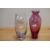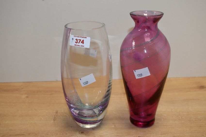 Two late 20th-century Scottish Caithness style vases, to include a 'Tartan Twist'-style vase, featuring a vibrant pink/purple controlled spiral pattern; sold with a tall, clear vase, having a single swirl decoration in pink and blue, both unmarked, 22cm and 20cm, condition is consistent with age and use, no visible chips or cracks.