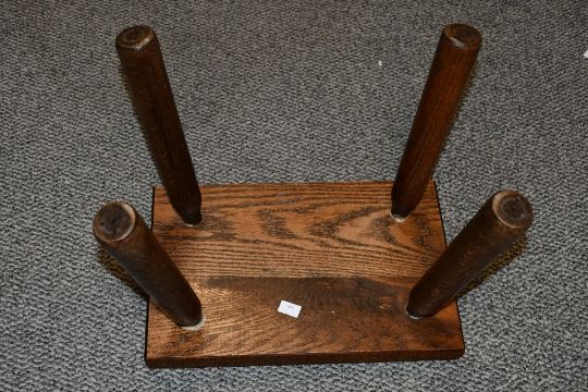 A vintage wooden stool, featuring a rectangular top with four thick tapered legs, unmarked, 32cm in height and 39cm x 26cm seat, condition is consistent with age and use, having some visible areas of surface wear seat and legs, sold as seen.