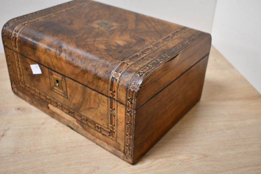 Two 19th-century hard wood boxes, to feature a walnutTunbridge ware-style sewing box, with detailed marquetry inlay and a brass bound rosewood writing slope; sold with a pair of French Lemaire Fabriquant of Paris opera glasses in original leather case, Opera glasses marked, (3), condition is consistent with age and use, visible interior and exterior wear to both boxes, writing slope is very damaged to interior with a section dedicated to chipped wood sections and the interior compartments from the sewing box are no longer present, all sold as seen.